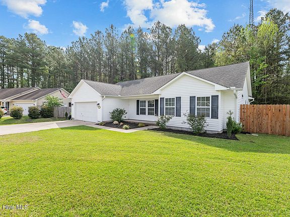 Nestled in a quiet cul-de-sac offering the perfect blend of comfort and convenience. Located just a short drive from Cherry Point Marine Base, Crystal Coast beaches, and close to downtown New Bern with its vibrant shops and restaurants, this home is ideal for those seeking both peaceful living and easy access.The split-bedroom floor plan ensures privacy for everyone in the household, with the primary suite featuring a walk-in closet, an en-suite bathroom complete with double vanity, and a walk-in shower. The heart of the home is the inviting living area, which boasts a cozy gas log fireplace—perfect for relaxing evenings.
