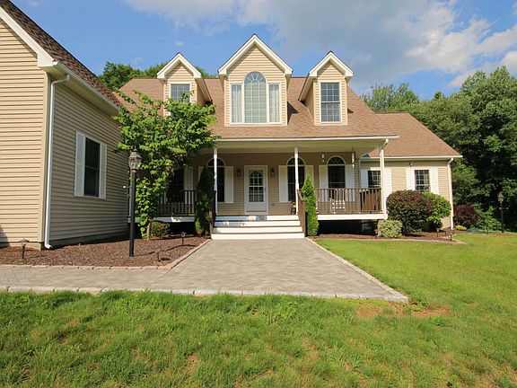 Pretty, Private and ahhh so Peaceful setting on 8.8 acres. A wonderful place for horses, llamas, gentleman's farming or free wheeling on ATV's. This lovely, custom home has so much to offer. Seller says, "everyone seems to gather in the kitchen along the long center isle, it's a perfect home for casual or formal entertaining" The family room is open and has a custom built stone front gas fireplace, lovely hardwood floors and an interior balcony. There is a 3 Season room off of the fam room with a ceiling fan and windows for admiring the lovely yard in the back. The Master Bedroom Suite is very spacious, has hardwood floor, ceiling fan and large walkin closet with California shelving. Master bath features a jacuzzi and dual sinks. The other 3 bedrooms are vary spacious and have new ceiling fans. There are 2 separate offices so working from home is now easier. The large bonus room has its own staircase and is perfect for an au pair or teen suite with its own shower and living area. Sit on the back deck and listen to the sounds of nature or catch a glimpse of some wildlife as it goes by. This home has so much to offer and you'll have to come see it to believe it. Some features are, security system, new hot water heater, generator, cent vac, beverage cooler, resealer driveway, walk up attic and finished lower level. Truly, a wonderful place to call home. Easy access to highway, fabulous restaurants, theater, schools and many conveniences. Close to NYC, Hartford and Boston