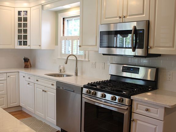 Quintessential New England! Charming Cape with classic details and modern style beckons you to come see! Newer kitchen just sparkles and make meal prep fun - ample white cabinetry, white quartz counter-tops, stainless appliances - gas stove, lots of storage and counter-space - and opens to spacious breakfast room, and nearby a covered back door entry and half bath. Front to back living room accented by wainscoted "Williamsburg" fireplace and custom cabinetry - a perfect setting for a cozy night at home. Accessed from the kitchen or living room, the screened porch is a favorite spot to relax, and opens to the blue stone patio overlooking a lush private backyard. Upstairs you?ll find the master with walk-in closet and half bath, plus 3 generous sized bedrooms with a classic black and white family bath. Additional living space in finished lower level family room with fireplace. Other amenities: roof 7 years, hardwood floors, central air, c-vac., gas HWT, oil furnace, attached 2 car garage with great garden/workshop room, fenced yard and drive, and attractive landscaping.