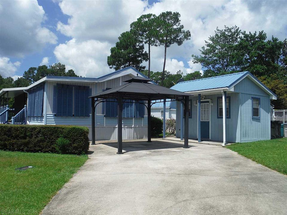 Not another one like this in the Cove! Upgrades almost too many to mention. Located on a corner lot this one bed, one bath park modle now includes Pergo flooring, custom hurricane shudders, new heating and cooling (2017), upgraded tie downs with aluminum vapor barrier, plus special metal roof on house AND on both sheds. An shed with stack washer and dryer, hot water heater plus shower and toilet with enough room for a cot. The workshop shed complete with air, pulldown stairs and it's own ventilation system is also connected to the gardening shed. The second lot includes a metal RV carport, concrete driveway with an attached shed.