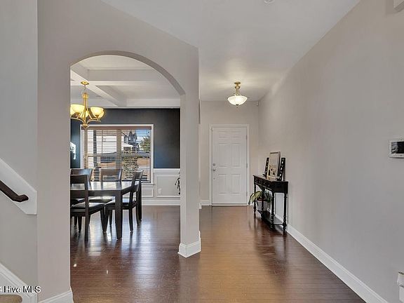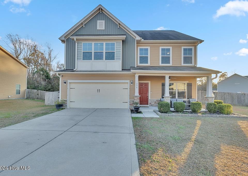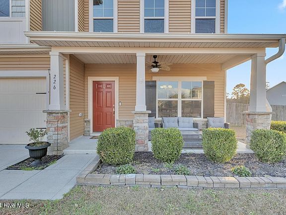 Nestled on a sprawling 1.33-acre lot in the desirable Moss Creek subdivision, this beautifully designed home offers 3 bedrooms, a versatile bonus room, and 2.5 bathrooms, making it the perfect blend of modern comfort and timeless charm. The inviting covered front porch opens into a bright foyer and formal dining room featuring elegant coffered ceilings. The heart of the home is the open-concept family room, warmed by a cozy corner gas fireplace, and the adjoining eat-in kitchen, a chef's dream with its granite countertops, subway tile backsplash, stainless steel appliances, sizable island with extra seating, walk-in pantry, and abundant cabinetry. A mudroom entry from the garage and a convenient half bath complete the first floor. Upstairs, the master suite is a luxurious retreat with a large walk-in closet, dual vanity, soaking tub, and separate shower. Two spacious guest bedrooms, both with walk-in closets, and a laundry room add to the convenience, while the oversized bonus room, featuring a charming window nook, offers endless possibilities for use as a playroom, home office, or entertainment space. Outside, the fully fenced backyard provides privacy and a perfect setting for relaxation or gatherings. Located in an established neighborhood close to shopping, schools, and Camp Lejeune, 226 Gladstone Drive combines thoughtful design with exceptional livability. Don't miss your chance to make this stunning home yours—schedule a tour today!