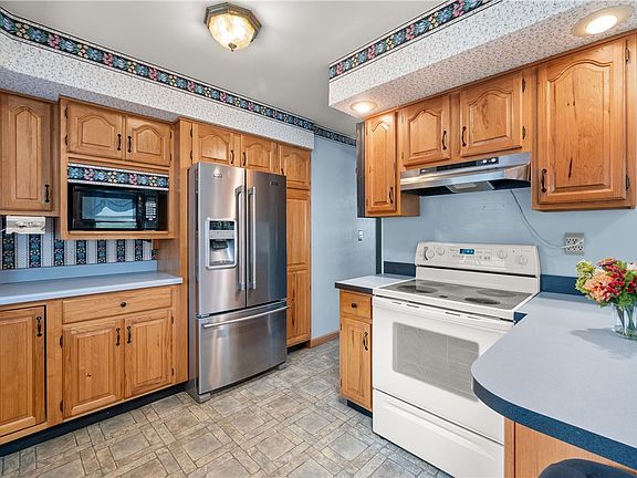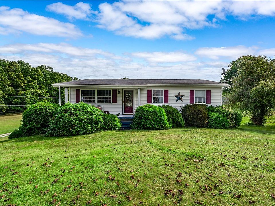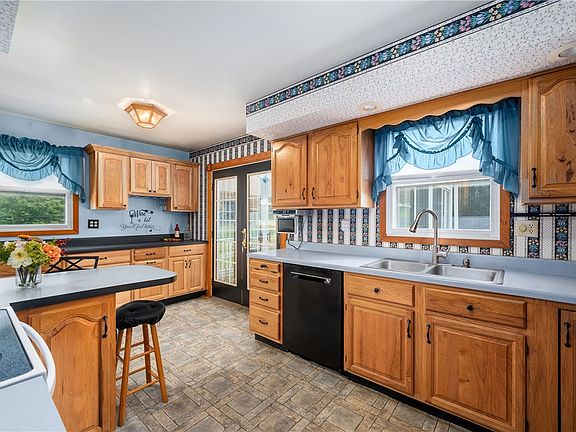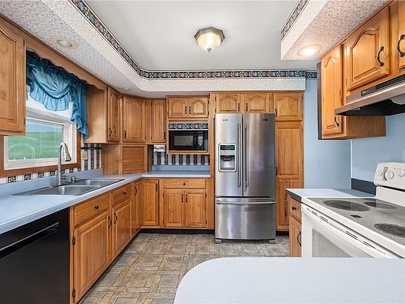 This charming 3-bedroom, 2-bathroom ranch-style home, located in the Knoch School District, is ready for your family to make it your own. Step into a welcoming sunroom featuring a vaulted ceiling and sliding doors that lead you to the inviting eat-in kitchen. Here, you'll be greeted by ample cabinetry, a generous pantry, and modern appliances. The main floor boasts a roomy living area adorned with crown molding, along with a deep coat closet, hallway attic access, and a well-sized main bathroom conveniently located next to the bedrooms. Downstairs, you'll find a recreational room complete with a bar, a secondary kitchen area equipped with a stove and cabinets, as well as a laundry space, potential room for a fourth bedroom, & extra storage areas. There's also direct outdoor access from this level. Outside, the property offers a 25'x28' detached two-car garage and an additional 14'x18' outbuilding. Nestled on a picturesque 2-acre lot, the home utilizes both gas and oil heating systems.