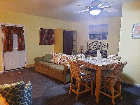 Utilities included with the rent. This non-smoking fully furnished studio includes central AC/heater unit, queen-sized bed, ceiling fan, and an open-plan kitchenette fully equipped with a hot plate, fridge, toaster oven, microwave, and coffee maker. The bathroom has a walk-in shower and a washer/dryer combo. Pets are not allowed. A $100, non- refundable, holding fee is requested to reserve the place. This $100 holding deposit will count toward your deposit fee, which is refundable based on apt. conditions at the time of departing. Since the property is within the premises of my home, I would prefer to rent the place to someone that will respect the values of my home and the neighborhood. I also run background check as part of the rental process. In addition to the $600 deposit, there is a $100 (refundable) cleaning fee. Non-smoking is a must. A nonrefundable $100 deposit is required in order to reserve the place for more than 2 weeks prior to move in. This deposit will count toward your cleaning fee if decide to rent the place. All utilities are included.