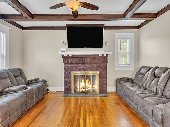 Welcome home to this enchanting 4 bedroom, 2.5 bath Colonial home! Bright and spacious living room features a brick fireplace with beautiful beamed ceilings. Make your way to the dining room offering plenty of space for gatherings and lovey bay windows.The open kitchen features an island, backsplash and storage area. The FIRST floor bedroom is a BONUS with a full bathroom. The second floor is welcomed by three bedrooms with gleaming hardwood floors and a full bath. The basement is complete with a finished area perfect for a workout space, family room or child's play area, a half bath and a laundry room. Enjoy your summer mornings in the sunroom then make your way outside to a wonderful patio with a fenced in backyard and a one car garage. OPEN HOUSE on Sunday, June 25th from 1:00-2:30PM.