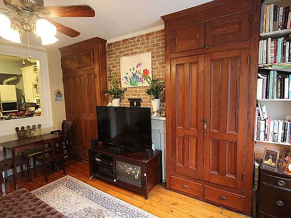 Great 1 bedroom plus den in well kept brick row house on desirable downtown Jefferson St. Classic living area with decorative fireplace mantle, exposed brick, restored original built-ins and custom wood blinds. Renovated kitchen with 42 inch white cabinets, granite counters, wine rack, ceramic tile backsplash and dishwasher, additional den can be used as office or walk in closet, rear bedroom with fireplace mantle, tall built-ins and en-suite bath featuring glass and ceramic tiles, other amenities include hardwood floors, ceiling fans, window ac, laundry in building and lush common backyard. Common area just redone, Close to midtown bus, light rail , Path and The Hop.