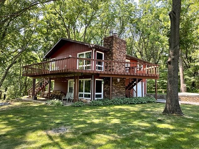 Get away to the quiet relaxation of Lake Thunderbird. This charming home overlooks a pond and wooded ravines, providing excellent wildlife viewing from the wrap around deck! Inside you'll find the warm comfort of a brick fireplace in the living room, with plenty of windows, keeping it light and bright. Light up some logs and stay cozy during cool evenings! The kitchen has been updated with new cabinets providing a modern feel, with plenty of work and storage space. Enjoy dining at the table while taking in the view from the large windows here. The main level also has two ample bedrooms and a full bath. Downstairs, a second living area has a wood burning stove and opens onto the large side yard which provides plenty of space for the kids and pets to play. It's also a great place to string up a hammock and take an afternoon nap amongst the trees! The lower level includes a 3rd bedroom, full bath, laundry, and direct access to the garage. This home is surrounded with beautiful views in both winter and summer. Lake Thunderbird is a private lake community providing fun for the whole family - boating, swimming, fishing, private beach, pool, tennis, Frisbee golf course, special events and more. The boat launch and docks are just across the street from this home for easy access to fishing and boating. Whether you're looking for a weekend retreat, or a full time home - quiet country living is just 2 hours from Chicago. New tankless HWH, new vinyl plank flooring, new furnace and AC, new high end water softener, roof replaced in 2007. Converted to natural gas - no propane! Truly ready for you to move in and enjoy lake life!