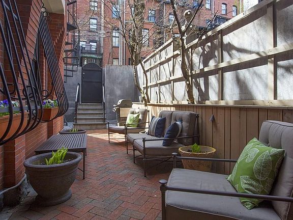 Stunning +-1,575 SQFT Parlor/Garden duplex w/ 2 private outdoor spaces in quintessential Back Bay Brownstone near the corner of Marlboro & Exeter. An array of architectural detail enhances the grandeur of the parlor level w/ hardwood throughout, pillars, crown moulding, tray ceilings, and marble in the gracious entry foyer. This home has an open flowing layout, high ceilings, & southwest exposure. Large eat in kitchen w/ Jenn Air appliances, custom cabinetry & stone counters w/sleek subway back splash. Wine fridge, & adjacent private deck make an ideal entertaining space. Secluded powder room w/ washer dryer. The lower level has large windows & gets a plethora of light,& has direct access to a large private patio. Both bedrooms are generous in size & have ample custom closets. Master has marble en suite. Central a/c, an abundance of storage throughout, including a +-75 SQFT direct access deeded room on lower level (not incl. in GLA). Elevator building & transferable rental parking.