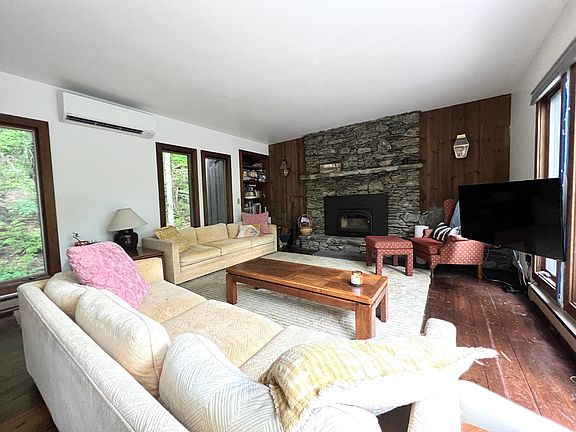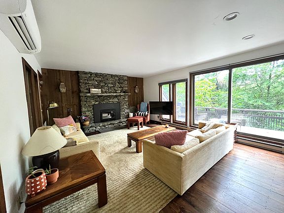 Our gorgeous mid-century modern 3 bedroom 2 bath furnished home is available to rent starting now - June 1, 2024. Designed by Robert Carl Williams, the first/upper level has an open living room with fieldstone fireplace, wide pine floors, natural woodwork, solid six-panel interior doors, and an abundance of windows and sliders that go out to the huge deck that is the whole width of the house. It's truly like living in a treehouse. Also on the upper level is the bright kitchen, first full bathroom/laundry room, and roomy closet. Downstairs has two large bedrooms and a third bunk-room bedroom and the second full bathroom (with bathtub). The house also has a large basement for storage. We bought the house three years ago and have replaced all carpet, painted, insulated both attic and basement, updated furniture, purchased a brand-new washer/dryer, installed huge Vermont Castings insert, and installed heat/AC pumps. The Green Mountain National Forest Peavine Area is a very short walk from the house - enjoy the White River every day! The house is 15 minutes or less from: Tozier's Seafood, Texas Falls, Sandy's bookstore and bakery, Rochester Square, Pittsfield Original General Store, Wild Fern, Sable. It's 30 minutes from: Randolph (Saap Thai, Thrift Shop, Book Shop, and Playhouse Movie Theater), Rutland (Farmer's Market, Walmart, Hannaford, Aldi, TJ Maxx, Home Depot, etc), Royalton (Worthy Burger), Bethel (Babe's Bar, Cockadoodle Pizza), and more. An hour and fifteen minutes from Burlington, Stowe and Montpelier are both about an hour. The house is extremely centrally located. Rent is $2800/month and includes: ECFiber high speed internet, water, electricity, firewood, and snow plowing of parking pad and road to house. Pets ok on a case by case basis and with a small pet fee. Please email me if interested. No application fee required. Refundable security deposit $2800. Rent is $2800/month and includes: ECFiber high speed internet, water, electricity, firewood, and snow plowing of parking pad and road to house. Pets ok on a case by case basis and with a small pet fee. Please email me if interested. No application fee required. Refundable security deposit $2800.