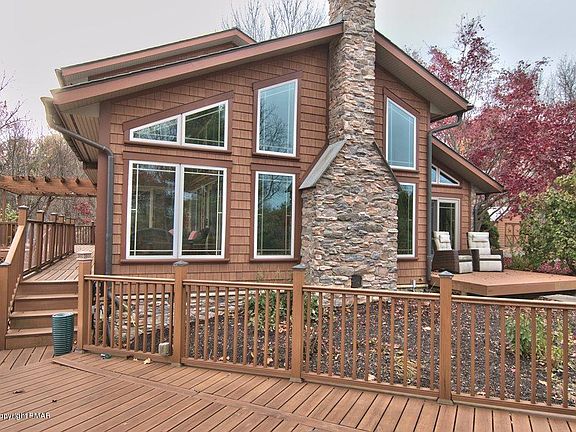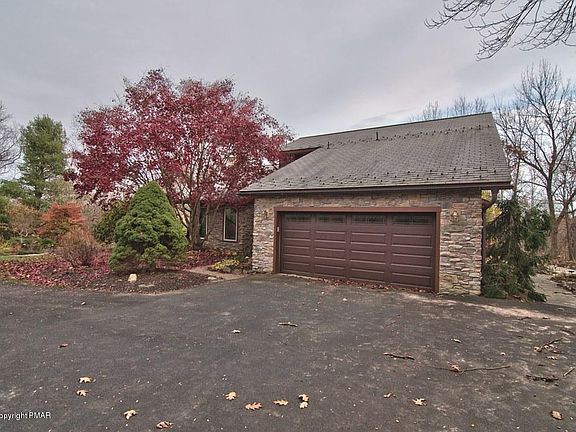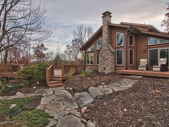 A BOTANICAL WONDERLAND! WITH 2 CASCADING WATERFALLS GOING INTO 3 DIFFERENT PONDS, THIS HOME HAS BEEN FEATURED ON HOUSE TOURS, AND THE POCONO RECORD! Completely refurbished exterior w/ stacked stone and copper accent gutters, new windows, the look of this home will WOW you! ALL FIRST CLASS MATERIALS USED! And walk right out to the massive deck in all directions, and jump in the inground pool! PLUS the kitchen rehad with HEATED tile designer floors, stainless appliances, a chef's delight 6 burner gas stove, will entice your culinary skills! The tiled powder room is a huge surprise too and has a HEATED FLOOR! 3 bedrms, 2 baths upstairs, Brazilian cherry flrs on the first level, full basement....AND 3 more parcels of land equal 5.25 private Paradise acres! Low taxes, SEE PHOTOS