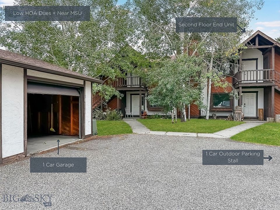 Are you looking for your opportunity to live near MSU and downtown Bozeman? This second level 2 bed, 1 bath condo, is just over 1,000 sq ft on a dead-end street. Each unit comes with a single-stall garage and designated parking space. Unit D is on the second floor of the building creating additional privacy. As you head up the stairs to the condo you will find a large storage area perfect for bikes, snowboards, or other recreational equipment. You will be welcomed home upon entering the front door by hardwood floors, a wood-burning fireplace, a small dining area, and a kitchen with all major appliances. The kitchen/dining area also has a large pantry for extra storage. There are two oversized bedrooms near the laundry area and a full bathroom. The laundry comes with a washer/dryer. Enjoy the convenience of Streamline Bus services nearby via the purple line on stop 27 which will take you to Downtown Bozeman, or via the gold line on stop 24 which can take you to the Montana State University campus.
