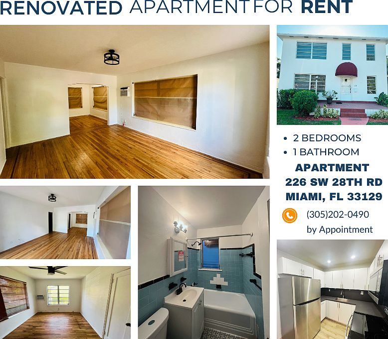 Large 2 bedroom 1 bath renovated apartment available for rental ASAP in the highly coveted Roads section of Miami off Coral Way and 28th Road. Just blocks from the entrance to Key Biscayne and 1-95, Vizcaya and Metrorail station. 5 minutes to Brickell and 10 minutes to Coral Gables and Downtown Miami. SECTION 8 ACCEPTED. Features: A Brand new complete kitchen with stainless steel appliances along with an updated subway tile bathroom with tub. Refinished original Dade county pine hardwood floors throughout. Plenty of closet and storage space. Main floor apartment with back door to large backyard with tiled table and benches. Plenty of room for BBQ and a large shared outdoor area. Washer and Dryer in the laundry room for tenant use and plenty of on street parking right at your front door. Rental Options: SECTION 8 ACCEPTED Annual lease unfurnished, pet allowed under 30 lbs. and with a Pet security deposit. Appointments for viewing call Stephanie Owner pays the water and maintains the property. Electric paid by tenant. 1 year lease preferred but may consider a month-to month tenancy depending on circumstances. No smoking allowed inside the apartment and adherence to common courtesy guidelines set forth regarding cleanliness and noise. Remove all recycling and garbage weekly. A rental application with references is required for background check.