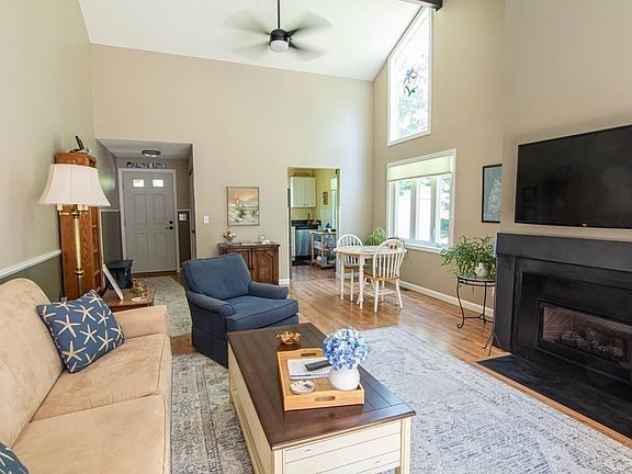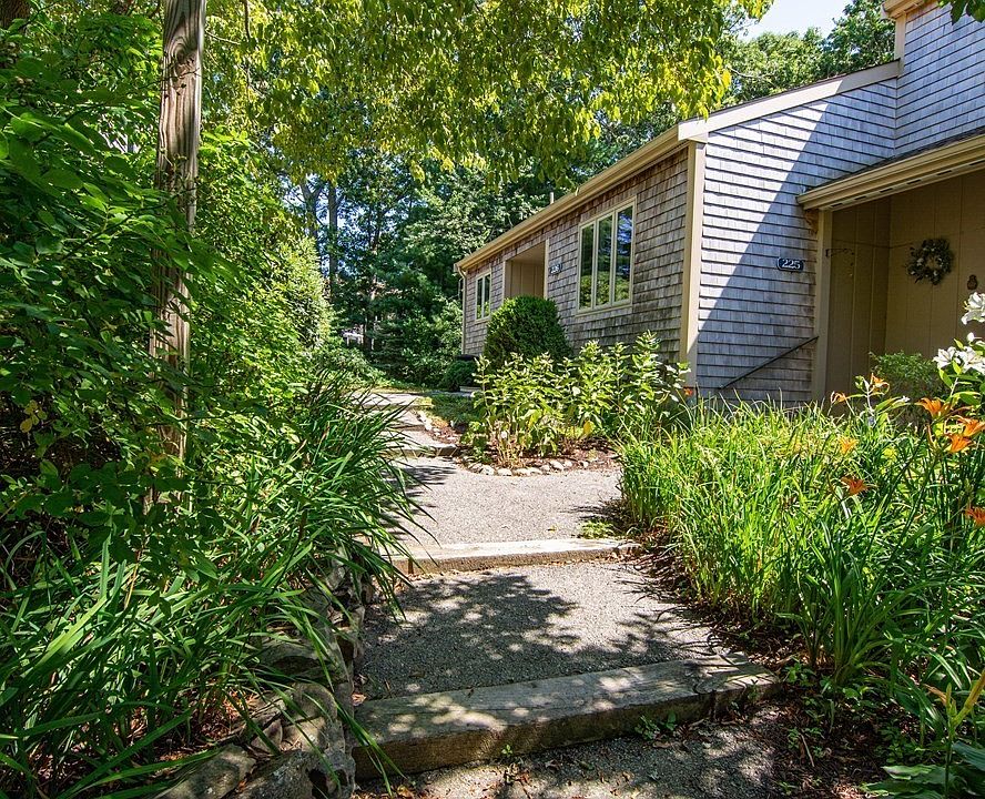 You will fall in love with this ranch style condo in the desirable Falmouth Port Condo Assoc. Situated down a tranquil walkway with a private green space this home beckons. Upon entry you are greeted with a spacious living room, with vaulted ceiling, gas fireplace, sparkling laminate floors, and newer sliders to a deck overlooking your private oasis. The remodeled kitchen offers granite counters, white cabinets and new windows. The en-suite primary bedroom with renovated bath features a walk-in shower, dressing area, laundry, and sliders to the deck. The second bedroom has an adjacent full guest bath. The lower level offers a large storage area. One room has heat and AC to keep your storage items well maintained. Falmouth Port has so much to offer… heated salt water pool, clubhouse, tennis/pickle ball court, walking trail, kayak racks and two dinghy docks. Close to all things Falmouth...ten beaches, dining, shopping and more. Come see and you won't leave...live the dream!