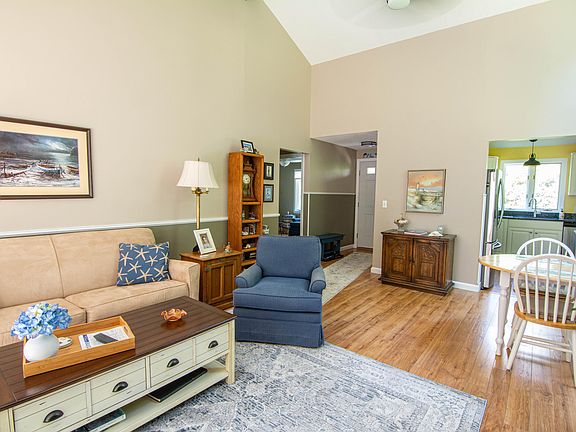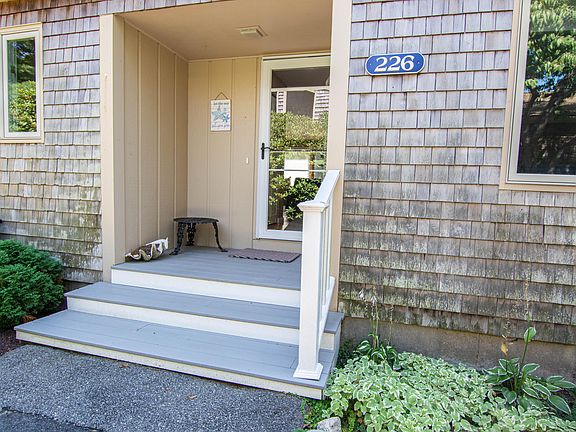 You will fall in love with this ranch style condo in the desirable Falmouth Port Condo Assoc. Situated down a tranquil walkway with a private green space this home beckons. Upon entry you are greeted with a spacious living room, with vaulted ceiling, gas fireplace, sparkling laminate floors, and newer sliders to a deck overlooking your private oasis. The remodeled kitchen offers granite counters, white cabinets and new windows. The en-suite primary bedroom with renovated bath features a walk-in shower, dressing area, laundry, and sliders to the deck. The second bedroom has an adjacent full guest bath. The lower level offers a large storage area. One room has heat and AC to keep your storage items well maintained. Falmouth Port has so much to offer... heated salt water pool, clubhouse, kayak racks, 2 dinghy docks, tennis/pickle ball courts, walking trail and more. Close to all things Falmouth has to offer including dining, shopping and recreational pursuits. Come see and you wont leave...live the dream!