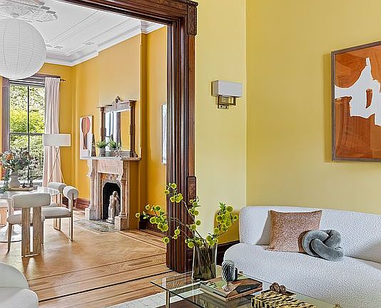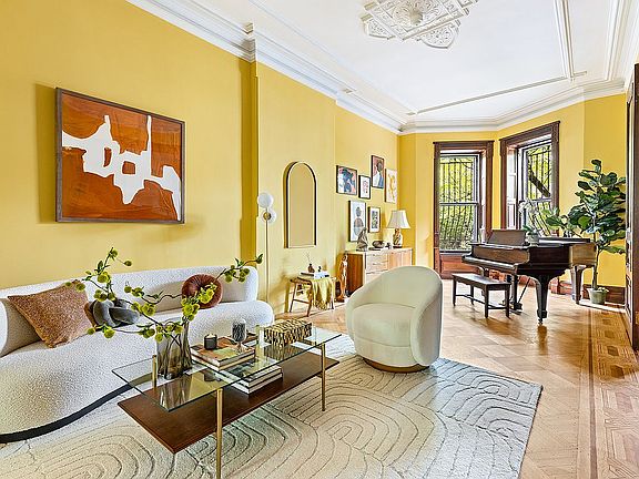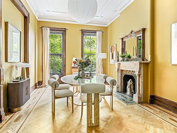 As you approach the classic Brooklyn stoop, the grand entry door invites you into a stunning parlor floor with nearly 12-foot ceilings and large bay windows that flood the space with natural light. The home features seven decorative fireplaces and immaculate details throughout, from the intricate millwork and moldings to the original, beautiful wood floors—making this space ideal for both entertaining and quiet moments of relaxation.