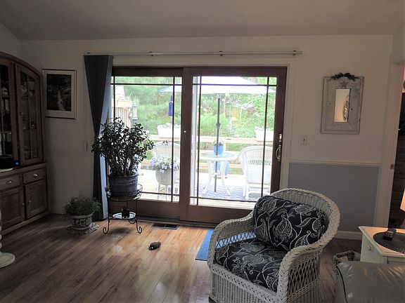 You will fall in love with this ranch style condo in Falmouth Port. Situated down a tranquil walkway with a private green space and garden, nature shines. Enter into a hallway which leads to the living room with a vaulted ceiling, gas fireplace, newer sliders to a deck overlooking the yard, and engineered wood floors. The large angular window and the sliders let in a profuse amount of sunlight. It sparkles! The kitchen is remodeled with granite, white cabinets and two windows which let in even more light. The master bedroom suite also has sliders to the deck, two closets and a dressing area. The second bedroom is in the front of the unit and has a full bath next door. The lower level houses the laundry and a large storage area. One room has heat and AC to keep your storage items well maintained. There is also a bulkhead for transporting items in and out of the lower level easily. Falmouth Port has so much to offer its residents: a heated salt water pool, a clubhouse with views to the Vineyard, tennis courts, two dingy docks, walking trails, kayak racks, a games field and so much more. Situated on Great Pond, Falmouth Port is located within an easy drive to beaches, boating, golf