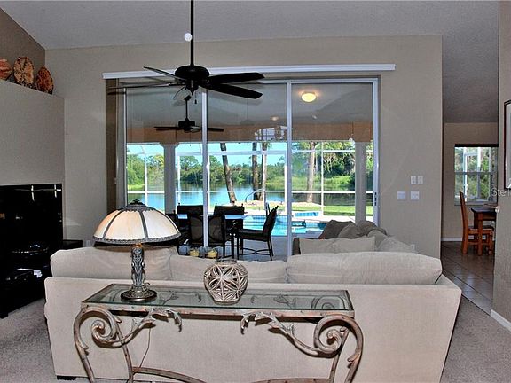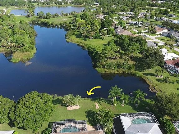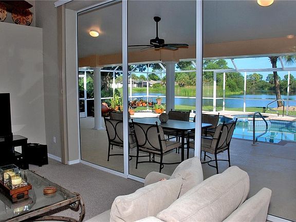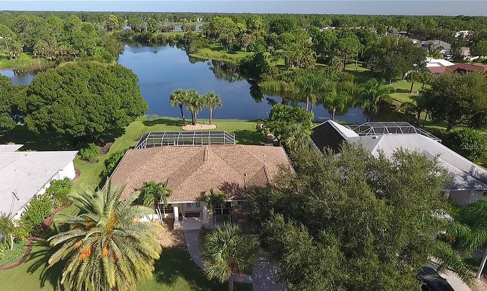 This immaculate home is very easy to fall in love with! Your first step over the threshold will pop your eyes wide open to spectacular lakefront views in a gorgeous, postcard setting. This home was designed to provide maximum enjoyment of these beautiful views by creating a seamless and sensual flow between inside and out. Architectural highlights that achieve this include towering 9' glass sliders and lots of decorative transom windows. The sliders open fully to allow the flow of gentle breezes, wafting fragrances, and the sounds of nature indoors. You can also enjoy the mesmerizing views from the pool, the waterfall spa, a shaded park bench near the water's edge, or the deep covered lanai. This heavily updated home has been meticulously maintained and professionally cleaned. It is a 3/2.5/2 with an office/den that can double as a 4th bedroom. Interior highlights include stone counters, porcelain tile, a garden tub, French doors, dual sinks in master and guest baths, plantation shutters, Hunter-Douglas blinds, a breakfast nook and eating counter, and a formal dining room. Structural highlights include arched doorways and soaring ceilings. Truncated walls are ingeniously connected to create intriguing angles and to further maximize the open flow of soft, natural light. Exterior features include storm shutters, free irrigation water, and lush landscaping. Expect to save up to $1,500 annually thanks to the X-Flood zone. Turnkey available separately. CLICK VIRTUAL TOUR for 100+ HD PHOTOS and DRONE VIDEOS!