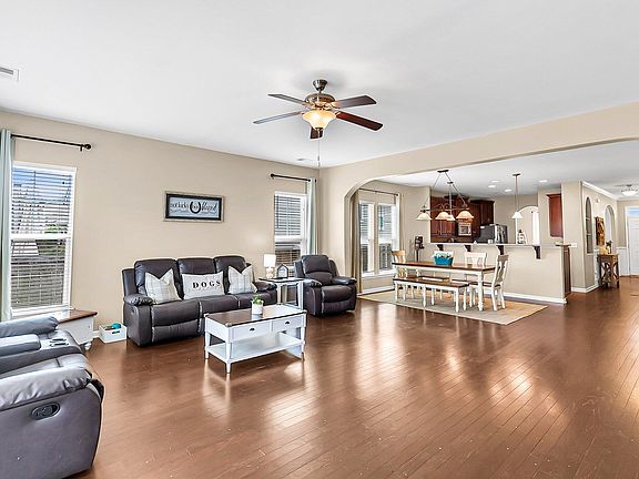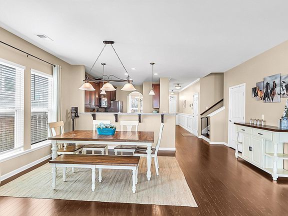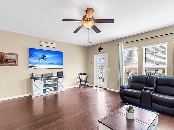 Welcome Home! A spectacular 4-bedroom, 2.5-bathroom haven perfect for those who appreciate blending of style, comfort, and functionality. Enter through the front door into a welcoming hallway with hardwood floors and wainscoted walls, setting the elegant tone for the rest of the home. The spacious, open-plan living area features hardwood floors, and a modern kitchen equipped with rich cherry wood cabinets, granite countertops, and stainless steel appliances.Upstairs, discover an oversized loft that offers versatility for your lifestyle -- a potential 5th bedroom, play area, or home office suite. The downstairs primary suite boasts a serene bedroom featuring a ceiling fan, walk-in closet and is accompanied by a luxurious en-suite bathroom featuring twin vanities and a separate gardentub and shower. The outdoor space is equally impressive with a well-kept backyard, a storage shed and a stone fire pit perfect for outdoor gatherings. Enjoy the community amenities, including a shimmering swimming pool and serene lakeside views.