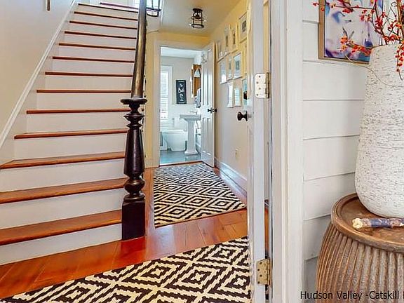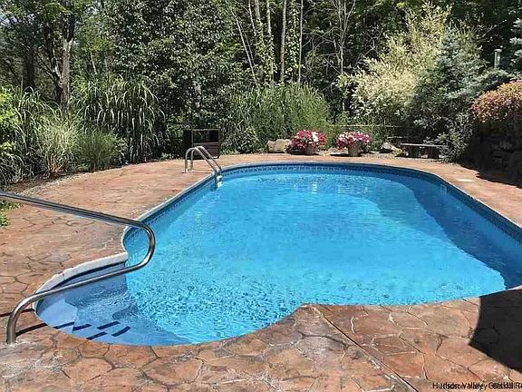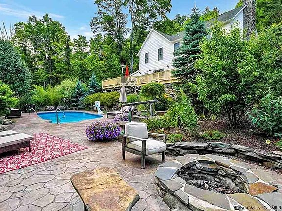 Have you been searching for your home in the incredible Woodstock-Phoenicia community? These sellers are offering their beautifully renovated farmhouse with its fabulous in-ground pool and lovely, lushly landscaped grounds after many years of enjoyment. The tastefully updated three-bedroom, two bath home has been completely overhauled with a dedication to its original charm, detail, and comfort while adding modern functionality as their New York sensibility demanded. Upon arrival the stone walkway leads you into the aura created by meticulously maintained gardens (just wait for the spring blooms!) and through the well planned and loved outdoor living spaces. An open lawn, custom fire pit and expansive stone patio surround the heated pool. There is a custom-built pond with its soothing sounds of a waterfall creating a spa-like, relaxing environment. A large deck runs to the rear of the house providing views of the pool, grounds, and mountains beyond. Tucked around the far side of the house is a charming stone retaining wall and private pergola with a sitting area next to the inviting outdoor shower, always the best after a warm summer swim! Inside you'll immediately notice that bright southerly light that fills every inch of the home and shines off the hardwood floors. A spacious bluestone floor welcomes one to the enclosed front porch. Here is the perfect place for boots, coats, and outdoor gear- or easily becomes a three-season morning sunroom and sets the stage for entry into the front hall. On the ground level are the oversized open living spaces that flow seamlessly between the kitchen/dining and family room. A wonderfully proportioned, gracious and more private living room with a winter warming cozy fireplace is located on the other side of the center hall entry. The exposed beams and built-in shelving in this sitting room highlight the classic farmhouse charm and create a more intimate and personal sense of space. French doors lead out to the large deck and pool beyond. The cook's kitchen with clean subway tiles and custom cabinetry includes stone countertops, a farmhouse sink, and stainless steel appliances with center island for increased functionality. The kitchen also opens out to the sunny large deck for enjoying true summer days and nights. The laundry room is tucked off to the far side of the kitchen for both family clothes or those summer pool towels. Upstairs, the large primary bedroom features vaulted ceilings with skylight, custom built-ins, a large walk-in closet, and a separate area divided by sliding doors - perfect for yoga, a nursery, or dedicated home office. Easy to add another bathroom in this large space as well. Two other bedrooms are separated by the custom bathroom with tiled shower and freestanding tub. The owners have long prized the ability to entertain many friends and loved ones thus, they have created numerous perfectly special spaces for gatherings both inside and out. The property has a one car detached garage; consider turning it into a studio workspace. And, just for fun a basketball hoop with a blacktop surface is situated alongside the garage. This charming bit of the Hudson Valley with its mountain views framing everything is located just minutes to skiing and hiking, shopping and dining in Woodstock, Phoenicia, and Kingston. Truly sited to enjoy all the Catskills and Hudson Valley offer throughout the year.