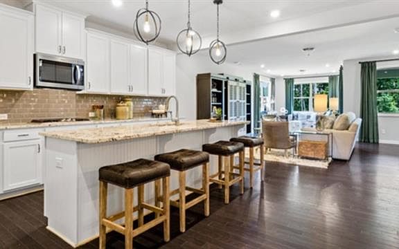 - Kitchen Features: Breakfast Bar, View to Family Room, Kitchen Island, Pantry Walk-In, Breakfast Room, Solid Surface Counters, Other Surface Counters, Cabinets White