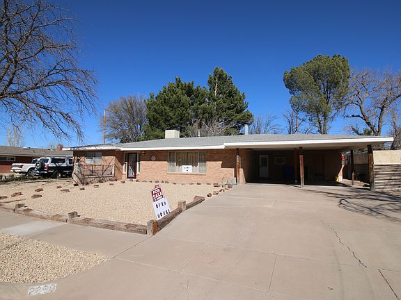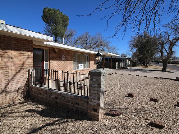 This house is an excellent example of a mid-century, ranch style, brick home. Its clean lines and ample space create a place that is ready to be comfortably lived in. There are 3 bedrooms and 1 ¾ baths in this home. There are two fireplaces, one in the small breakfast area adjacent to the kitchen, and the other in the large bonus room in the rear of the home. The floors in the majority of the house are either tile or engineered wood, with carpet only remaining in the bedrooms and the bonus room. The roof was newly installed in 2016, and the carport is large enough to protect two cars from the intense Las Cruces sun. The surroundings are quiet, and the neighborhood is filled with mature trees. This is a house that you have to see to appreciate.
