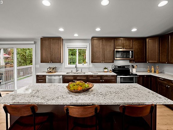 This stylishly updated entertainer's dream is bright and spacious, radiating elegance and contemporary charm. With vaulted ceilings and an airy, open concept design, this home merges style with functionality. The dreamy kitchen takes center stage, serving as the heart and command center of this home. The main floor boasts three generously-sized bedrooms and two full baths, ensuring comfort and convenience. Downstairs you'll find the family room and flex space perfect for relaxing, entertaining and offering a world of possibilities including multigenerational living or the creation of an ADU. Elevate your daily routine with morning coffee or evening wine on the expansive new deck. Surrounded by lush landscaping and the privacy of your own fenced grounds, enjoy the serenity provided by the pond. For those cozy fall evenings, two fireplaces offer warmth and ambiance. The oversized two-car garage is perfect for tinkering, and don't miss the side parking for toys. Conveniently located just steps from Hollydale Elementary and Hollybrook Park, this home offers easy access to amenities and recreation, making it a wonderful place to nest. Full system updates make for peace of mind.