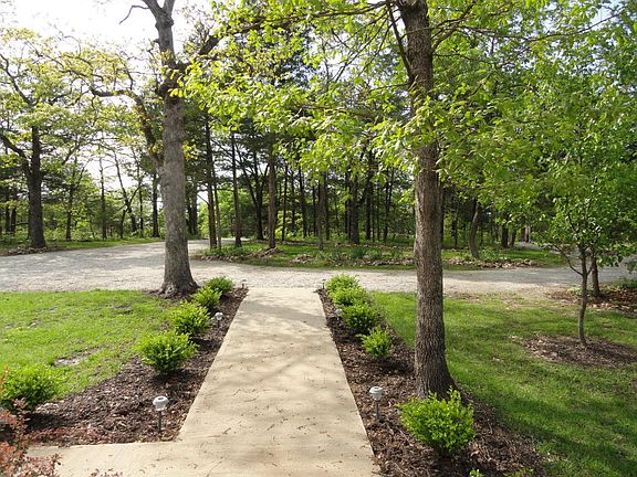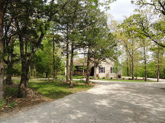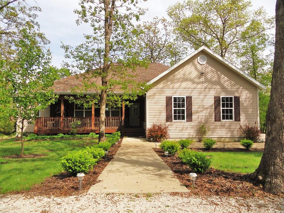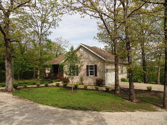 Nestled just 12 miles from downtown Branson, this cozy lake view 3BR, 2BA, 1367SF home offers open concept living, dining and kitchen with private split bedroom floor plan. Welcoming front porch, expansive covered deck and terraced fire pit create perfect nooks for entertaining with views of lawn, colorful perennial gardens, private wooded backdrop and tranquil Bull Shoals Lake. This peaceful 3-acre lot adjoins protected Corps land and promises a bounty of birds and wildlife. Attractive gas log fireplace, charming rustic accents inside and out, custom wall mural, soaking tub and walk-in shower in MBA, private deck access from MBR, large closets, all appliances, upgraded Trane heat pump in 2010. Attached 2-car garage, detached 10x16 shed, chip & seal circle drive plus nearby lake access.