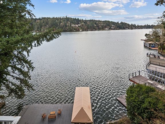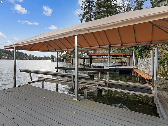 Seller will participate in rate buy down and closing costs. Welcome to waterfront living with breathtaking panoramic views of Lake Oswego, featuring 5 bedrooms, 4.5 bathrms, and 3797 spacious sqft. The architectural masterpiece of the home features expansive floor-to-ceiling windows that stretch across the entirety of the soaring, vaulted great rm, blurring the lines between the sumptuously appointed interiors & the tranquil waters beyond. An opulent modern marble gas fireplace stands as a centerpiece, casting a warm, inviting glow enhancing the ambience for grand soirées or intimate evenings. The contemporary, open-plan great rm flows seamlessly to the main-level primary suite, creating a harmonious living experience. The indoor & outdoor spaces meld effortlessly through strategically placed, expansive decks that offer ample entertainment space without sacrificing idyllic views. Culinary dreams come to life in the gourmet kitchen, adorned w/top-of-the-line built-in stainless-steel appliances, including a professional 6-burner gas range w/a sleek hood & dual ovens. Pristine white cabinetry abounds, offering abundant storage, while a chic breakfast bar invites social interaction w/guests without ever losing sight of the enchanting lake through the perfect picture windows. The luxury extends to all 4 ensuite bdrms w/lake views, including a show stopping primary suite on the main w/dual walk-in closets & contemporary glass & tile bath w/twin vanities. Direct patio access from the primary & a lower bdrm adds a touch of indulgence. A versatile den offers additional space for relaxation or work, while a secondary living area on the lower level mirrors the upper panoramic lake views. Two additional bdrms, a laundry suite, & a wine storage rm enhance the lower level. Embrace the luxury w/your private dock & covered boat storage, and for the ultimate in relaxation, a hot tub awaits on the patio, promising soothing soaks under the stars.