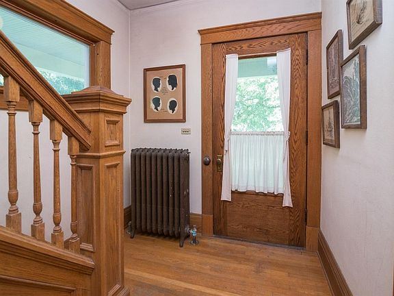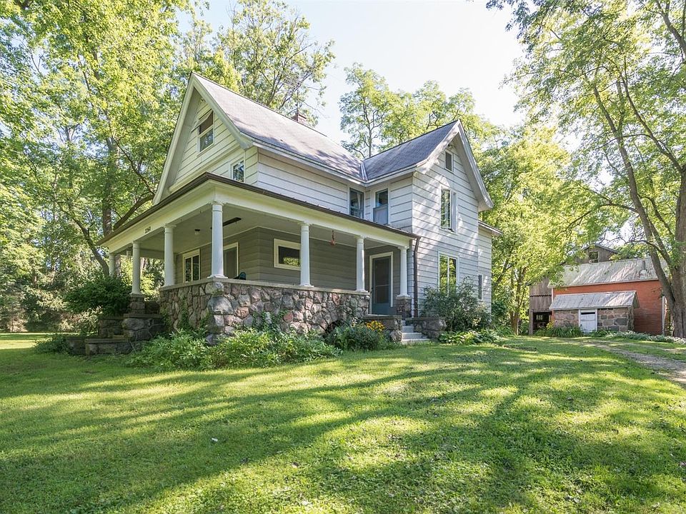 This beautiful solidly built 1912 farmhouse with a wraparound porch sits on idyllic 3.5 wooded acres with a wonderful year-round stream, surrounded by city parkland. Original oak floors, woodwork and 9' ceiling on the first floor; clear pine floors and four largish bedrooms on the second floor. Walk up third floor has many possible uses. The large kitchen and bathrooms await modernizing. Basement has 8' ceilings, a game room and two large unfinished utility rooms. Outbuildings include an antique timber frame barn- recently used as two car garage, ice-house and stone smoke house. Two lots, a total of 4.95 acres, are available to buy with the house. See listing number 3268566.