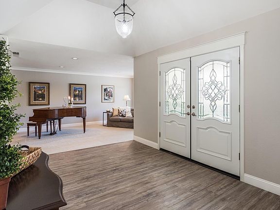 Gated Showplace off Van Ness Extension!!! This amazing single level gem is on a 37,050 sq. ft. North/South facing corner lot in the exclusive and highly desirable Extension Homeowners Association! Ambiance galore as you step through the double door entry to the large foyer capturing views of the Formal Living Room, Formal Dining Room & Family Room beyond. Adobe walls, lots of glass, beamed tongue n' groove ceilings in FR and office PLUS stunning luxury vinyl plank waterproof flooring thruout much of the home! This 3 bedroom, 3 bath home features a fabulous large office w/ floor/ceiling windows capturing the view of the spectacular grounds w/ pool, arbors & fountain!The gorgeous kitchen remodel (2016) has transformed this home into an entertainer's dream w/rich cabinets & counter tops, farm sink, walk-in pantry, high end appliances, breakfast bar w/pendant lighting & is open to a Lanai! Huge Master w/fireplace & garden bath! Lots of room for toys w/ 3-car garage + lots of extra parking!