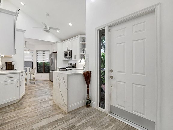 This stunning villa in the highly sought-after Meridiana has been beautifully updated throughout! 2 bedrooms plus a versatile den or 3rd bedroom. Spacious, enclosed air-conditioned sunroom with hurricane impact windows. Volume ceilings, beautiful tile flooring, smooth ceilings with hi-hat lighting, fresh paint, and new window treatments. Kitchen has white cabinetry, quartz counters, stainless steel appliances. Master suite offers a built-in walk-in closet with a safe. Master bath features double sinks, an extra-large shower, and a quartz-topped vanity. 2nd bedroom has a custom walk-in closet, and the den is enhanced with a sleek barn door for added privacy. A/C 2021 and water heater 2018. Situated as an end unit, with private corner location. Community pool and a small clubhouse.