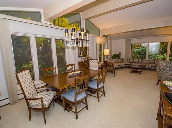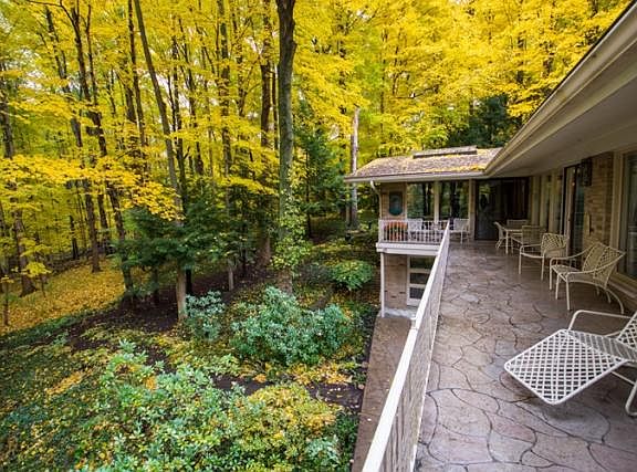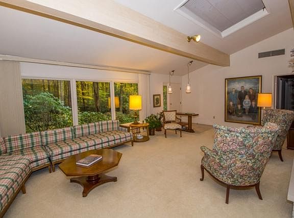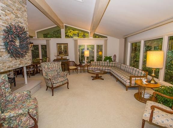 Magnificent mid-century ranch is the perfect mix of period finishes and modern updates. This unique property, tucked-in to the landscape, welcomes you at the end of a long, tree-lined, picturesque driveway. Just beyond the entryway is the great room. A spacious area with vaulted ceilings awash in natural light from the many over sized windows. The focal point is a majestic brick fireplace. The dining room flows easily from the living room and is open to the kitchen. The kitchen features granite counter tops, hardwood flooring and plenty of prep work space. You will feel as if you are part of the breath-taking scenery in the family room, rich with wood floors, walls and accents. Three walls of massive windows offer beautiful panoramic views. The master bedroom en suite is showcased by a private patio and large sliding doors. Three additional bedrooms provides plenty of room for family or overnight guests. Lower level walkout is the ultimate in recreational spaces. Charming wood paneling, fireplace and bar make this the perfect gathering spot. This home offers an open floor plan, 3500 sq. feet of real living space, vaulted ceilings, skylights, walls of windows bringing in loads of natural light plus panoramic views of the grounds. A truly beautiful setting with professionally landscaped yard and treed privacy.