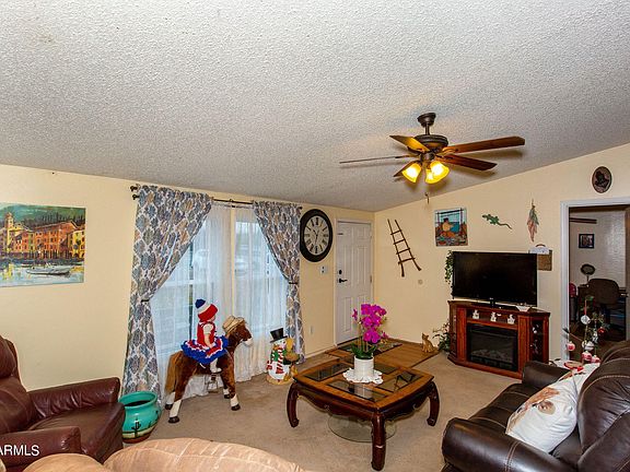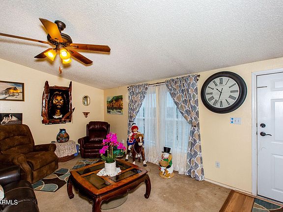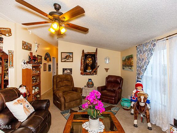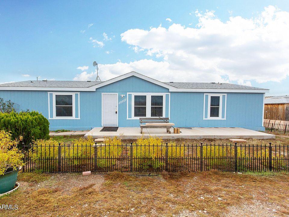 Charming home in a quiet neighborhood in Wittmann. Paved roads to the property. This fully fenced horse property has 5 sheds and 2 workshops! A large front porch to greet guests. This 3 bedroom, 2 bath home includes a bonus room. A large kitchen with a spacious pantry. Eat-in kitchen and dining area to entertain. New garbage disposal. A split floor plan with comfortable sized rooms. This double wide home has a new roof, windows and comfort height toilets in 2016. Easy maintenance deck, air conditioner and door with built-in blind in 2017. In 2020, 2 Smart locks and Smart thermostat were installed. The exterior of the home was painted December 2022! Easy care landscaping front and back on a timed drip system. Plenty of parking, including 3 carports! Bring your RV too! Two/50 AMP RV Hook-ups! This delightful home is ready for you to enjoy!