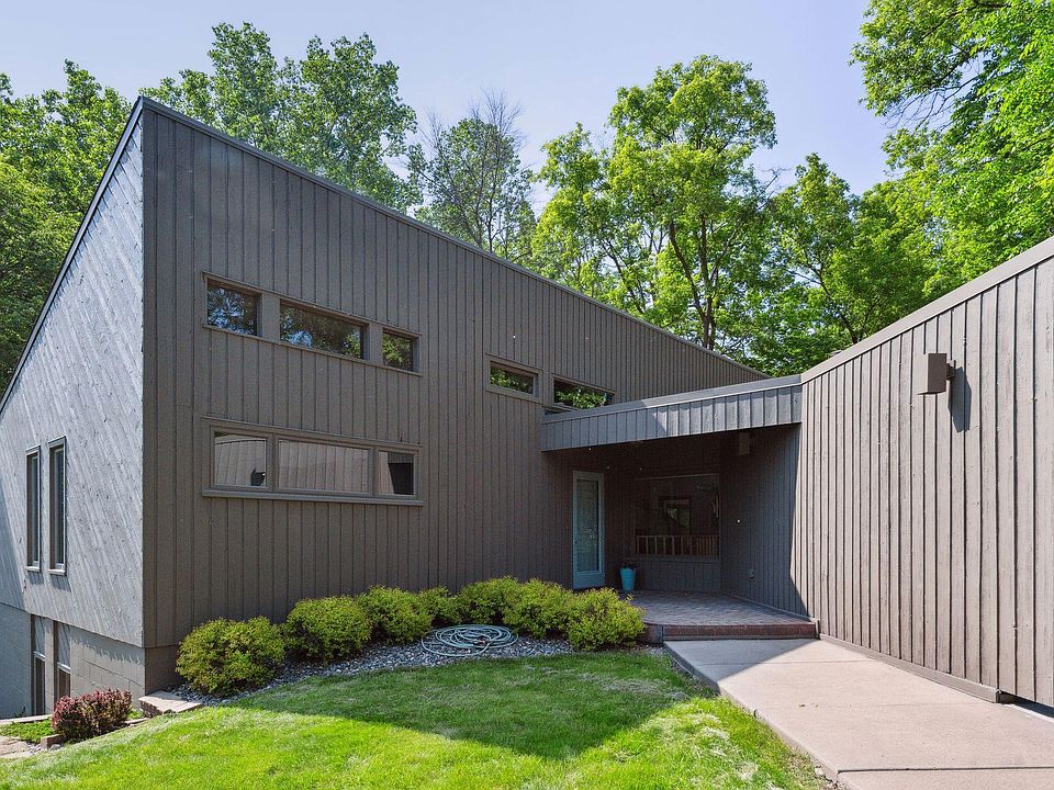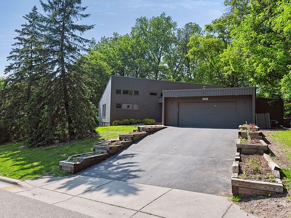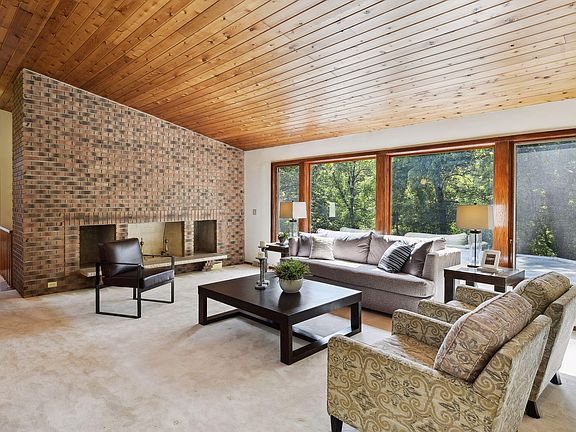 Exciting opportunity to make this 1976-built contemporary your own! You'll be struck by the dramatic architectural features: wood beamed ceiling, brick wall fireplace, clerestory windows and skylights that bring in natural light throughout the home. Terrific main floor living - everything you need for daily use, in spaces scaled for modern life and entertaining. Main floor includes owners' suite with bath, second bedroom/office and 3/4 bath. The lower level has three more bedrooms (two are ensuite), a family room with brick wood-burning fireplace and bar area, plus fun flex space, a sauna and additional storage. Hobbyists will appreciate the additional lower level workshop room. Windows frame nature views throughout. Nestled in a lovely setting on the edge of a cul de sac that backs up to Bassett Creek, it has a very private, natural feel - all just minutes from the convenience of nearby amenities and the city. Imagine the possibilities!