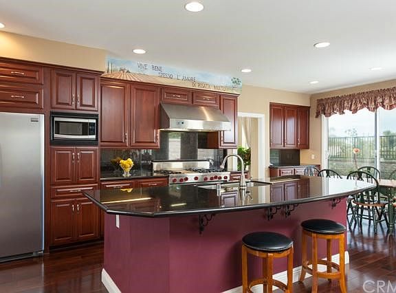 Pristine, turnkey home behind the private gates of Canyon Crest. The property, located towards the end of a cul-de-sac on a single loaded street, offers privacy and tranquility. This open and expansive floor plan boasts over 3,400 square feet of living space with 5 bedrooms, including an en suite bedroom, 4 bathrooms. The main floor bedroom offers quiet space for guests or can be used as an office. Beautifully remodeled gourmet kitchen with granite counter tops, top of the line appliances and hardwood floors opens up to the great room, perfect for entertaining! As you head upstairs the cathedral ceilings offer stunning views on both sides. Romantic master suite with a beautiful fireplace is airy and bright with lots of natural light. Step outside and enjoy good company around the fire pit with views of the hills nearby. With all new relined piping and gas/electric provisions for the built-in BBQ, this exquisite home is move-in ready!