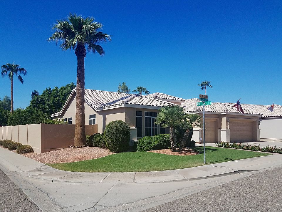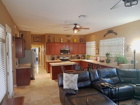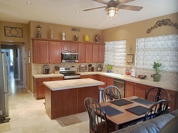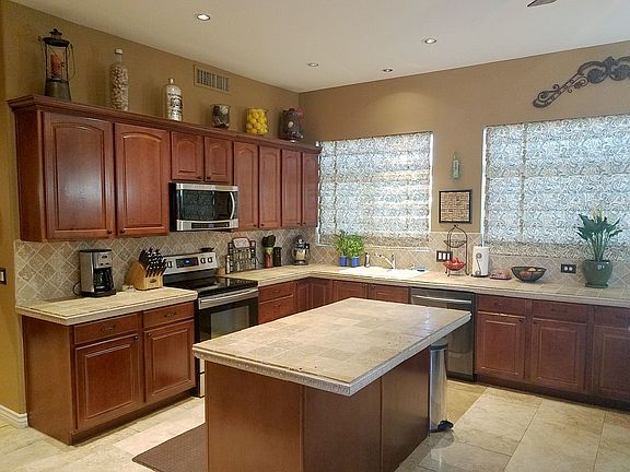 Beautifully elegant one story home on corner of small cul-de-sac. This home has been upgraded and remodeled throughout. The Travertine floors grace the living room, dining room, kitchen and hallways. Kitchen features decorative tile counter tops and sandstone back splash with updated wood stain cabinets and stainless steel appliances. Dishwasher and water heater are both newer. Both master bath and hall bathrooms I've been remodeled with newer fixtures, both lighting and faucets. This large master bedroom supports a king size bed with direct access to the pool. All of the lighting throughout the home has been updated to the latest designs while interior walls have been painted. All baseboards have beautifully designed 6 inch baseboards throughout. There is a newer air conditioner which is the newest energy efficient variable speed A/C which can be linked to your Wi-Fi and operated by your mobile phone along with your in home security system. This home also has numerous timer systems for lights that have been installed at the switch plates. The backyard is large, elegantly designed with a pool and pergola patio cover for entertaining. Patio is made of Travertine blocks and large grass area for kids or dogs. Large ficus tree provides shade for home and comfort for afternoon parties. 3 car garage has epoxy floors and painted interior . Refrigerator, Washer/ Dryer and Garage Freezer included with home. All within walking distance of shopping and upscale Sports Bar.