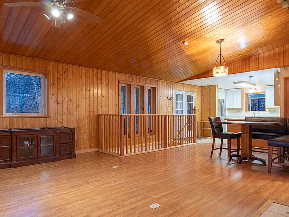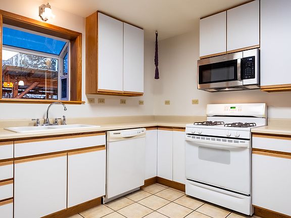 The main living area is located on the second level, where you'll find the kitchen, living room, all three bedrooms, and two full bathrooms. The kitchen features a walk-in pantry and opens onto a covered porchperfect for enjoying your morning coffee or summer evenings. The cozy living room offers a wood stove for warmth and charm. The primary suite includes dual closets, an en-suite bathroom with jetted tub, and a private deck that opens to the side yard. A stacked washer and dryer is located in the hallway just outside the primary bedroom. The first level includes an oversized one-bay garage with a work area, extra cold storage, and a full bathroom with shower. Interior stairs connect directly to the living space above, providing both convenience and functionality.