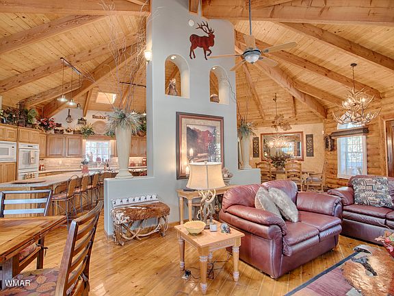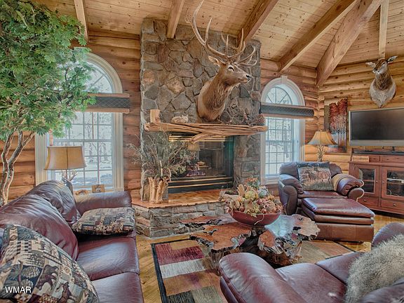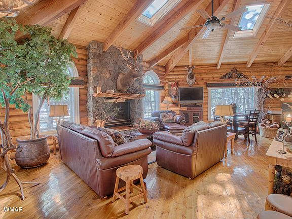 Incredible log home in Pinetop, AZ. Unique octogan living room with vaulted ceilings and open kitchen with two separate wings. One wing houses the master suite and game room and the other wing has two bedrooms, bath, and laundry, leading to 2-car garage. Gorgeously decorated, this home is being sold furnished. Home is on 2.5 acres and has a private well. Covered front and back decks. Back yard area is partially fenced. Outdoor spa is next to a small stone building (500 sf) that has heat and electricity to it. This could be a workshop or whatever you want it to be. It also houses the well equipment. No HOA. One of the sellers is licensed to sell real estate in Arizona.