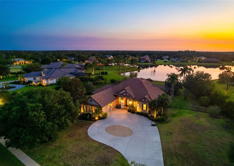 Luxury living perfected: experience sunset serenity. This exquisite home in The Preserve at Panther Ridge offers a harmonious blend of luxury and nature where every detail has been curated for your busy life. Nestled on a sprawling 1.49-acre parcel, this home boasts panoramic lake vistas and unforgettable sunsets, making it one of the most coveted properties in the neighborhood. Enter through double doors to the main level, where you will find a private office to your right with built-in bookcases and a sitting room to your left. Continue through the arched doorways past freshly painted walls towards the main entertaining space, where the chef's kitchen has stone counters, stainless appliances, and a large island open to the dining area and living room with sliding door access to the backyard. While hosting, step outside to indulge in the ultimate Florida lifestyle with an expanded covered lanai, fenced backyard, and captivating water views. The downstairs primary bedroom suite is a retreat unto itself, with expansive lake views, dual walk-in closets, and a master bath adorned with a stand-alone tub, separate shower, and dual vanities. Three additional bedrooms, including two suites with access to their own 12x12 bonus space, each with access to the new air conditioning system and thermostats, complete the first floor. The upper level of this residence offers a versatile space that can be used as a bedroom or bonus room, complete with a full bath and office area. Other Improvements include: Newly painted interior (2024), Professional Carpet Cleaning (2024), Upgraded Thermostat (2024), Newly Serviced Generac Generator (2023), Septic Pumped (2023), Upgraded High Pressure Direct-Line Well Pump (2023), Professionally Pressure Washed Roof and Driveways (2023), New Air Conditioners (2023 & 2024), New Pool Pump (2023), Exterior Home Uplighting (2022), New Fence (2021), Driveway extension (2021), Septic Tank Pumped( August 2024). The Preserve at Panther Ridge offers its residents an array of amenities, including scenic walking trails, parks, a playground, picnic areas, basketball, and a tennis court, fostering a vibrant and active community lifestyle. Additionally, the community is conveniently located just minutes away from the Waterside and Lakewood Ranch shopping and dining districts, providing easy access to a plethora of entertainment and culinary experiences. ****Possible lease to purchase option available.