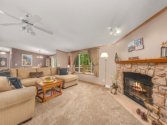 One of the most popular and unique floor plans Now available in Remington Woods! This 3 Bedroom, 2 Bath 1800+ sf home has been lovingly maintained and ready for you to call home. "News" include, Roof 2017, Furnace 2019, Deck 2018,Refrigerator 2019, Floors only a few years old. Large, open concept living room with fireplace. Home backs up to the tree line, making it one of the more desirable lots in this 55 and Up Community. Call to schedule your showing today!