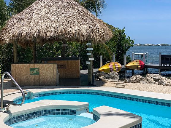 Neptune's End is the perfect island getaway home. This home sits ocean front and has unobstructed views of Cudjoe Bay out the Atlantic Ocean. This home has it all. A split-level property with main home upstairs featuring 3 bedrooms, 2 full bathrooms, custom kitchen, stainless appliances, granite counter tops, formal dining area, large living room, cathedral ceilings, oversized windows, plank wood flooring and screened patio to watch the sunset out over the bay. The downstairs features an additional master bedroom and full bathroom, wet bar and large entertainment area complete with couches, flat screen TV and sound system. The downstairs opens out to the back patio which comes furnished with conversation lounge sets, outside dining area, gas grill, large pool with spill-over spa, lounge chairs, hammock, private sandy beach, pier and dock for up to a 30' boat! Within walking distance to The Square Grouper or 420 Lounge a Key's favorite for dining and libations. Head 20-minute South and you are in Key West where you can enjoy world famous Duval Street, visit the Historic Seaport, Mallory Square, Hemmingway House and so much more. This home is the perfect Key's hideaway and is great for families and for those who want to have their own private resort!