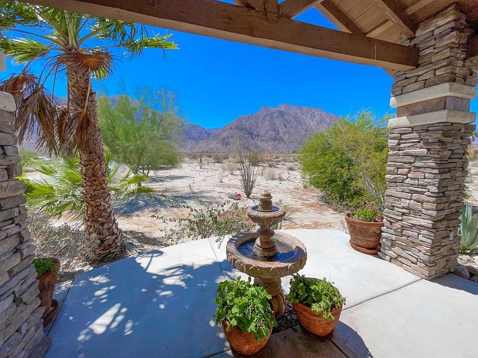 Located in an area of nice homes on large lots on Hoberg Road with no homes between it and Indian Head Peak and Palm Canyon. Fabulous views from living room windows and front patio. House was built to have picture window in living area feature Indian Head Peak and Palm Canyon view. Panoramic Valley and Santa Rosa mountain views from arched windows on both sides of fireplace with views from living area and dining area . Front patio at home entrance has two stone faced columns and vaulted beamed roof structure, and has room for table and chairs to enjoy siting, and enjoy desert and mountain views. A fountain is centered between the stone columns. 8 ft. front entry door with ornamental glass is recessed off center of roofed patio. Window from office or den looks out on front patio and desert and mountains beyond. When you enter the front door the foyer floor is travertine. Double doors off the foyer to the right open to the office/den/library, which has 3 file cabinets in the closet space. Could be used as a 3rd. bedroom. Living area with vaulted ceiling is off foyer to the left and is open to the dining area. Dining room double doors with glass, open east to enjoy sunrise Fonts Point and valley views. They open to the patio off dining room for evening barbecues in the late afternoon shade and coffee or lounging in the morning sun. A hillside beyond the back patio has concrete steps down to the oasis created around 6 palms. From the dining area patio, a cement walkway extends to a patio off the master bedroom which also has double doors with glass. A hot tub type spa seats four is on the master bedroom patio, partially shaded by two palm trees and plantings The master bedroom has a coffered ceiling with decorative fan over a king size bed. Master bedroom opens by arched portal to master bath and 4 ft.X 5 ft. shower with marble shower walls, Master bath has L shaped marble double vanity and large jetted tub with marble surrounds. The commode is separate room behind door to it. The guest room also has a king size bed, It has desert valley view. There is a direct door to the hall bath making it serve as a guest suite. The hall bath has a single sink in a large marble vanity, toilet, and shower over tub with marble surrounds Direct access from hallway to double car finished garage, through laundry room with broom closet and laundry sink beside washer and dryer All flat access from garage to house. and from front patio to front door. Offered furnished as displayed. Items in garage do not convey Seller is a California licensed real estate broker.