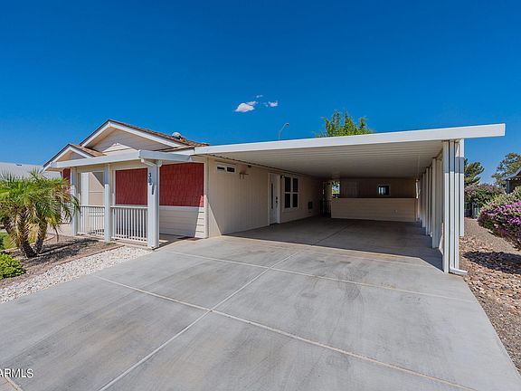 This beautiful, furnished, move in ready home is located in the desireable 55+ community of Rancho Val Vista Estates. Professionally landscaped and adorned with a cute front porch and oversized carport! As you enter through the front door, you'll be greeted with vaulted ceilings and a nice dining and bar area that allows you to entertain guests. The kitchen has beauitul dark wood cabinets, lots of counter and cabinet space, new SS farmhouse sink, and a newer refrigerator. Split floorplan with the spacious primary bedroom with bay window which faces west - so there will be no sun waking you up. Primary bathroom is quite large with lots of cabinets and a skylight. The second bedroom is at the back of the home so your guests have more privacy. The laundry room has lots of storage as well as a pantry. The backyard has trees that provide shade and an area that you can sit out with guests to BBQ. The desert landscaping has a rain guard drip system. The storage shed does have a workbench. New roof (2023), new HVAC (2023), new water heater and new water softener (2023), new carpet (2024). Ceiling fans are in all rooms and the home is equipped with an alarm system. The community ammenities include pool, hot tub, pickleball, shuffleboard, cornhole, horseshoes, club house, workout area and a 4 lane bowling alley! Lot rent includes water, sewer and trash. Average summer electric bill last year was $152.00 (June through September). Primary bedroom furniture doesn't convey.
