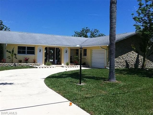 Nestled on the Shakespeare Canal and just a corner away from direct access to the Gulf is this cozy dream home in the Golden Coast Estates neighborhood. This little jewel is move-in ready with upgrades that are desirable for any home buyer. Lots of light enter the triple slide doors in the living room. The ceramic tiles throughout main areas including flooring on outside screened in porch make for easy cleaning. Split floor plan with master bedroom and private shower. Two other spacious bedrooms with lots of closet space and views of canal and landscaping . Second bathroom with tub for relaxing after a long day! The kitchen features an L-Shaped granite counter top spacious for entertaining guests, modern wooden cabinets for organized storage and stainless steel appliances. Outside dock provides the perfect backdrop for relaxing sunsets and inspiring sunrises and occasional private dolphin spotting from your dock.