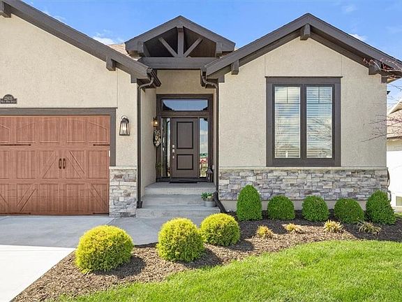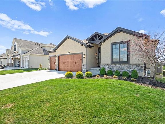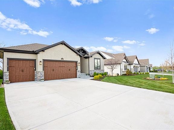 Experience easy living in this stunning, lightly lived-in reverse nestled in a picturesque tree-lined lot. Boasting a sun-drenched great room with a cozy stone fireplace and a bonus built-in office, this gem offers functionality and charm. The heart of the home is a gorgeous kitchen w/ all Bosch SS appliances, inviting culinary delights w/ its double-wide sink, 5-burner gas cooktop, and walk-in pantry. Enjoy serene views of nature from the covered deck. Indulge in the luxury of the primary suite featuring double sinks, a spacious walk-in shower & a connected walk-in closet & laundry rm. With a manicured lawn, granite countertops & upgraded fixtures, this home offers a harmonious blend of comfort & elegance. The inviting LL boasts a spacious second living area w/ a full wet bar, SS bar fridge, & granite countertops. An epoxy-coated patio extends the living area outdoors. With a third bdrm & full bath, plus unfinished storage space, this home offers comfort & versatility. This special property offers the unique opportunity to opt in or out of the HOA lawn care maintenance & snow removal for $162/month. Amenities like walking trails, ponds (coming soon, pool, play area, pickleball, pool house & more) Easy walk to Lake Lenexa and Black Hoof Park.