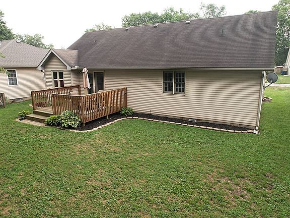 Fully furnished, move-in-ready home in quiet Amber Woods Subdivision. This home has had a brand new roof put on with the warranty transferable to the new home-owner. Located at the end of the Cul-de-Sac. Large living room area, vaulted ceilings, deck with peaceful wooded backyard. Recent updates include fresh paint in all rooms and on trim, new 50 gallon hot water heater, new water softener, new shower heads and bath faucets, new door handles, new garage and front door digital locks, new smart thermostats, new toilets, custom built garage shelving and workbenches, new kitchen lighting, new electrical switches and covers as well as all electrical receptacles, new fridge, new microwave and hood combo, custom built kitchen table and custom built desks, outdoor fire pit, new attic and garage lights, new flagpole, and new Ring doorbell. Also includes: furnishings, couches, table, chairs, bed, two large TV's, and electric fireplace.