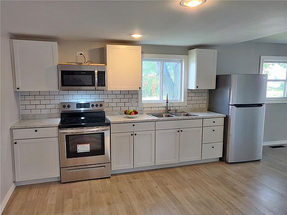 One story home, move in ready and worry free. This home has been newly remodeled inside and out. All the big items are new, including the roof, siding, windows, furnace, hot water tank, flooring, kitchen and bathroom. Attached oversize one car garage. Nice size living room with added overhead lighting. The kitchen is appointed with stainless appliances, black on white cabinetry, and dining area. First floor laundry and utility room. Enjoy the large leafy yard from the private back patio.