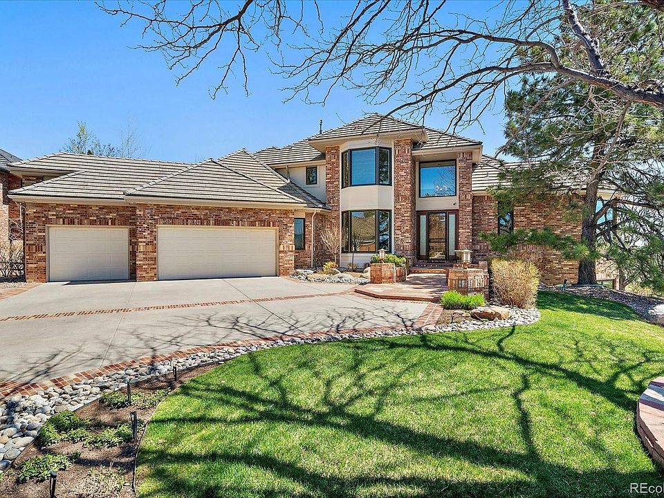 Nestled at the end of a cul-de-sac against acres of open space, this warm and welcoming 5-bedroom 6-bathroom home has breathtaking views of the Rocky Mountains. It is the perfect setting for luxury main floor living and entertaining with easy access to Downtown Denver and mountain highways. As you step through the front door, you will be greeted by striking curved staircases and newly installed, high-end fiberglass windows that introduce spectacular morning sunrises in the living room and provide sensational views throughout the home. Tucked away to the right is a large, secluded main floor primary bedroom suite with a cozy sitting area, fireplace, five-piece bathroom with an exceptional mountain view, and a custom alder wood walk-in closet. To the left of the entry, the private dining room and butler’s pantry are perfect for gathering family and friends. Down the hallway is the incredible eat-in chef’s kitchen with designer alder wood cabinetry, high-end appliances and a walk-in pantry. The kitchen connects into the adjoining great room, boasting a 14-foot brick fireplace and a custom Crestron entertainment center with a home automation system. Step out unto the deck to enjoy more incredible views and the covered dining area with a Viking grill, fire pit, custom lighting scenes and overhead gas heaters. On the upper level, you will find a loft sitting/study area, along with two large bedrooms with private baths and walk-in closets. The lower walk-out level provides a spacious family/game room, beautiful sunroom with views, built-in wet bar, private office, workout/theater room, two additional bedrooms with private baths and walk-in closets, and a large storage room. The spacious laundry room and heated 4-car garage with custom storage cabinetry are premier additions. This home is remarkably well maintained, with a flowing floor plan and impressive upgrades that are purposefully designed to stand the test of time. Come experience this beauty for yourself!