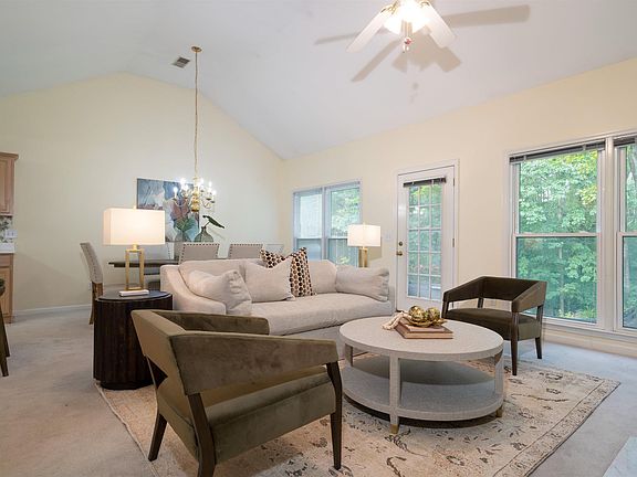 Welcome to 2265 Ascot Lane. This 2 bed, 2 bath townhome is located on a quiet culdesac in the Steeplechase neighborhood. All on one level (zero steps), this home has great closet space and storage, and a one car garage. There is a spacious kitchen that is open to a dining room and living room with soaring vaulted ceilings and a gas fireplace. The vaulted ceilings continue into the master bedroom, where you'll find a walk-in closet, and large en-suite bathroom. The bathroom includes a jetted tub, separate shower, vanity area, and a large linen closet. There is a patio area out the back door, that looks over that natural beauty of the area. Convenient to I-65 and I-459, and just around the corner from beautiful Aldridge Gardens. This home has had one owner and has been well-loved. Come see what makes this one hard to leave!