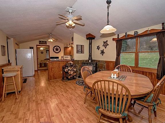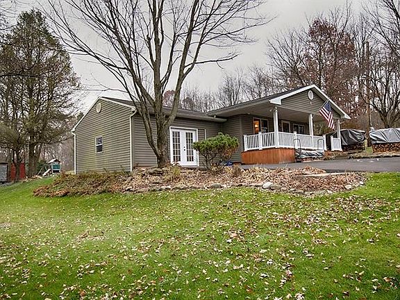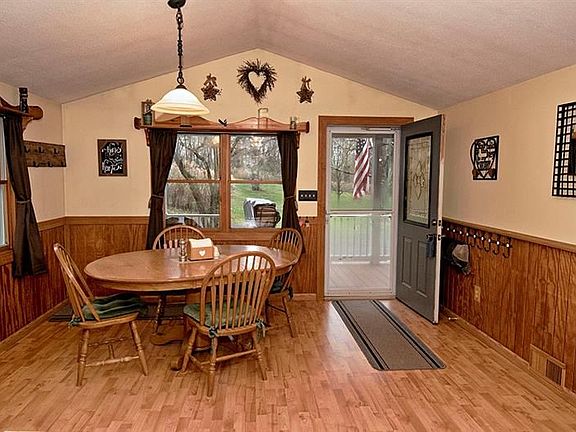 Beautifully updated & impeccably maintained, it's single floor living at it's finest! Located on 2.6 acres in a gorgeous country setting, you are welcomed by a private driveway & a beautiful landscape including a pond & a spacious front porch. An open floor plan awaits you! The dining room & kitchen both feature vaulted ceilings, oak trim & new Pergo flooring. A wood burning fireplace enhances your enjoyment of the surroundings. The living room gets great natural light and is the perfect space for family activities. The master bedroom is spacious and is underscored with a large closet, newer carpet & Pella windows. The second bedroom has a closet with built in storage options. The third bedroom could also be used as a den and has a slider to the great outdoors. Walk out onto your sprawling yard! The additional finished space can be used as a game room, work room or could be converted into a garage.