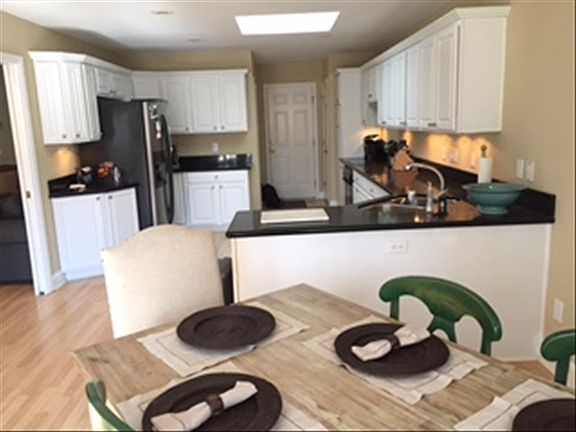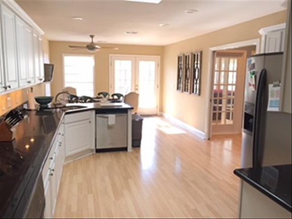 Immaculate home on quiet cul-de-sac, full of upgrades and custom features, clean lines, glowing with natural light. Oversized eat-in kitchen delights with a skylight, solid quartz counters, recessed and under-cabinet lighting, KitchenAid oven/flat cooktop, Kenmore Elite fridge, dishwasher and abundant storage. Fresh paint. Pocket French doors to great room with 10-ft ceiling, fireplace, surround sound. Tray ceiling in master suite and jetted garden tub. The bath has double vanities, custom 6-jet shower, another skylight and custom California Closet system. Front bedroom has a vaulted ceiling. French doors open to sunny Florida room. All rooms have remote controlled ceiling fans. Moon shades cover all the windows for one-way privacy when open or room darkening when closed. Pristine laminate flooring through-out the house, and tiles in the bathrooms/laundry room. Laundry room with built-in cabinetry; washer & dryer included. Large, private fenced backyard with outdoor speakers on custom bi-level stained deck, landscaped yard has a sprinkler system with irrigation well.